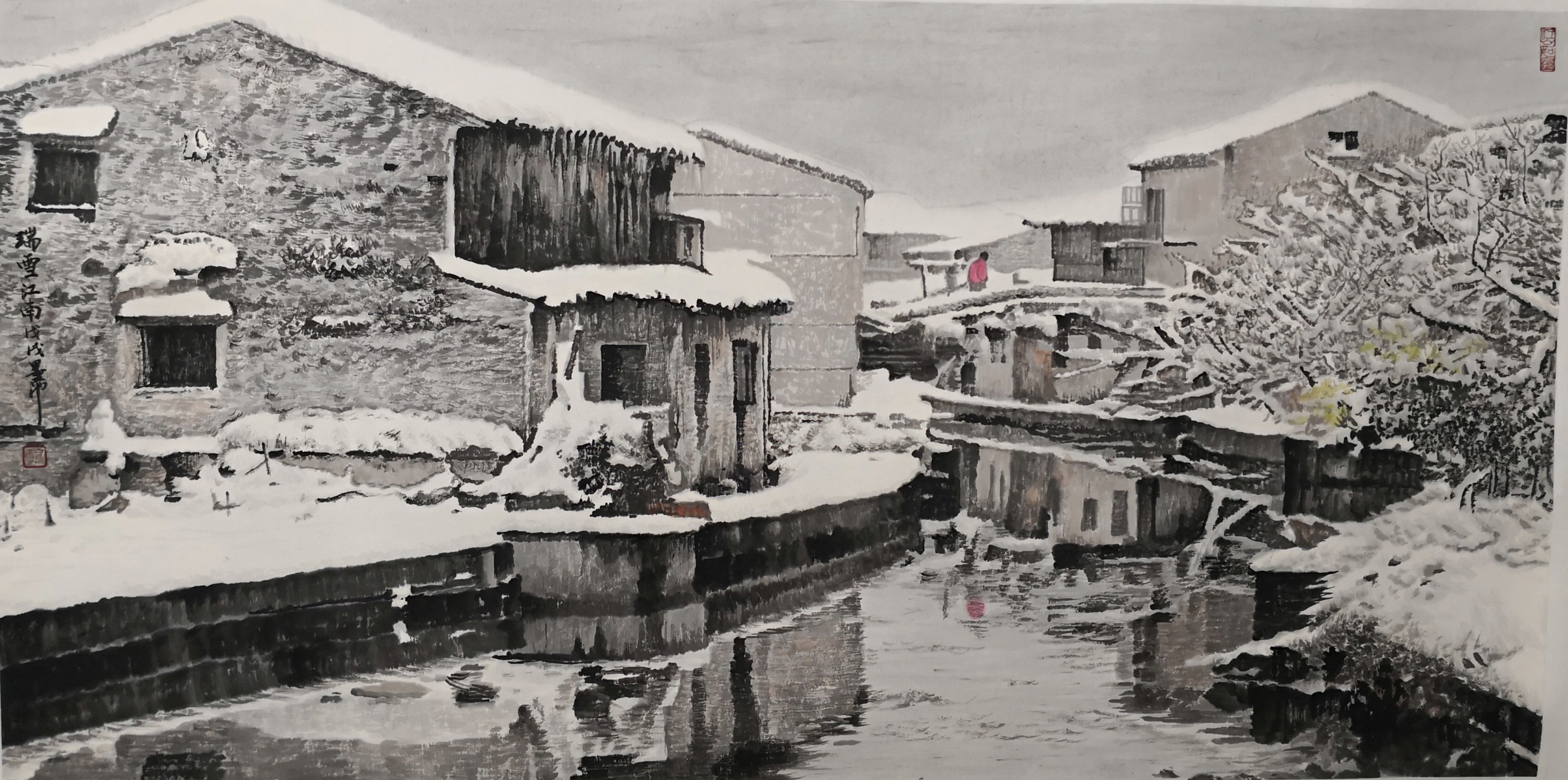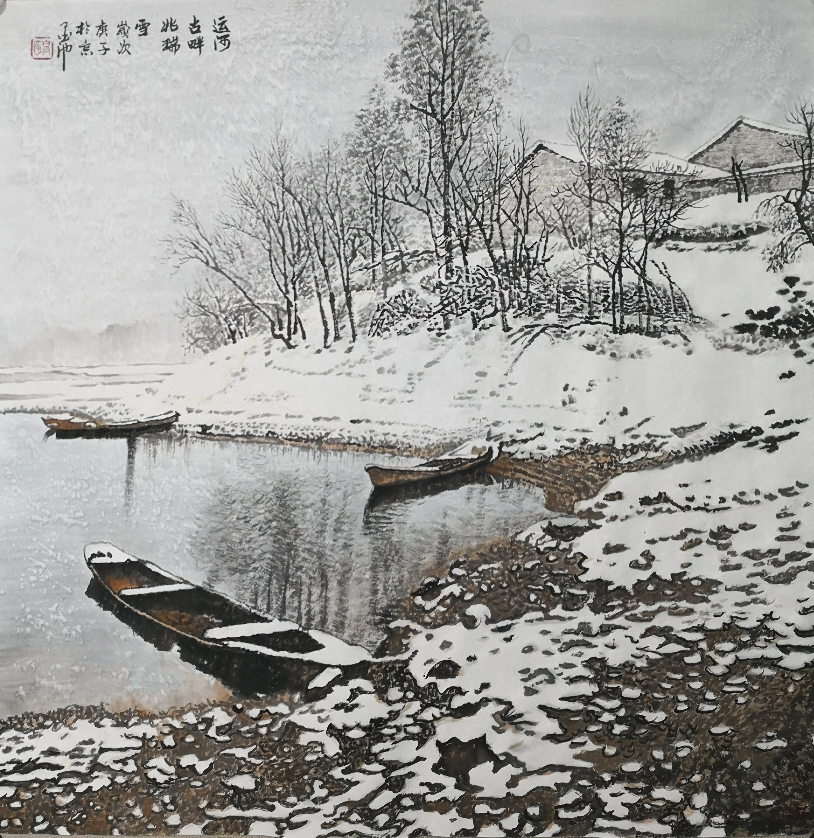 色彩的革新创造。他在传统水墨的灰白基调中,融入极淡的蓝紫、青绿,创造出独特的“冰雪色谱”。这种色彩运用既保持了东方绘画的含蓄韵味,又赋予了冰雪以真实的清冷质感,在“随类赋彩”的传统法则中开辟了新的可能。