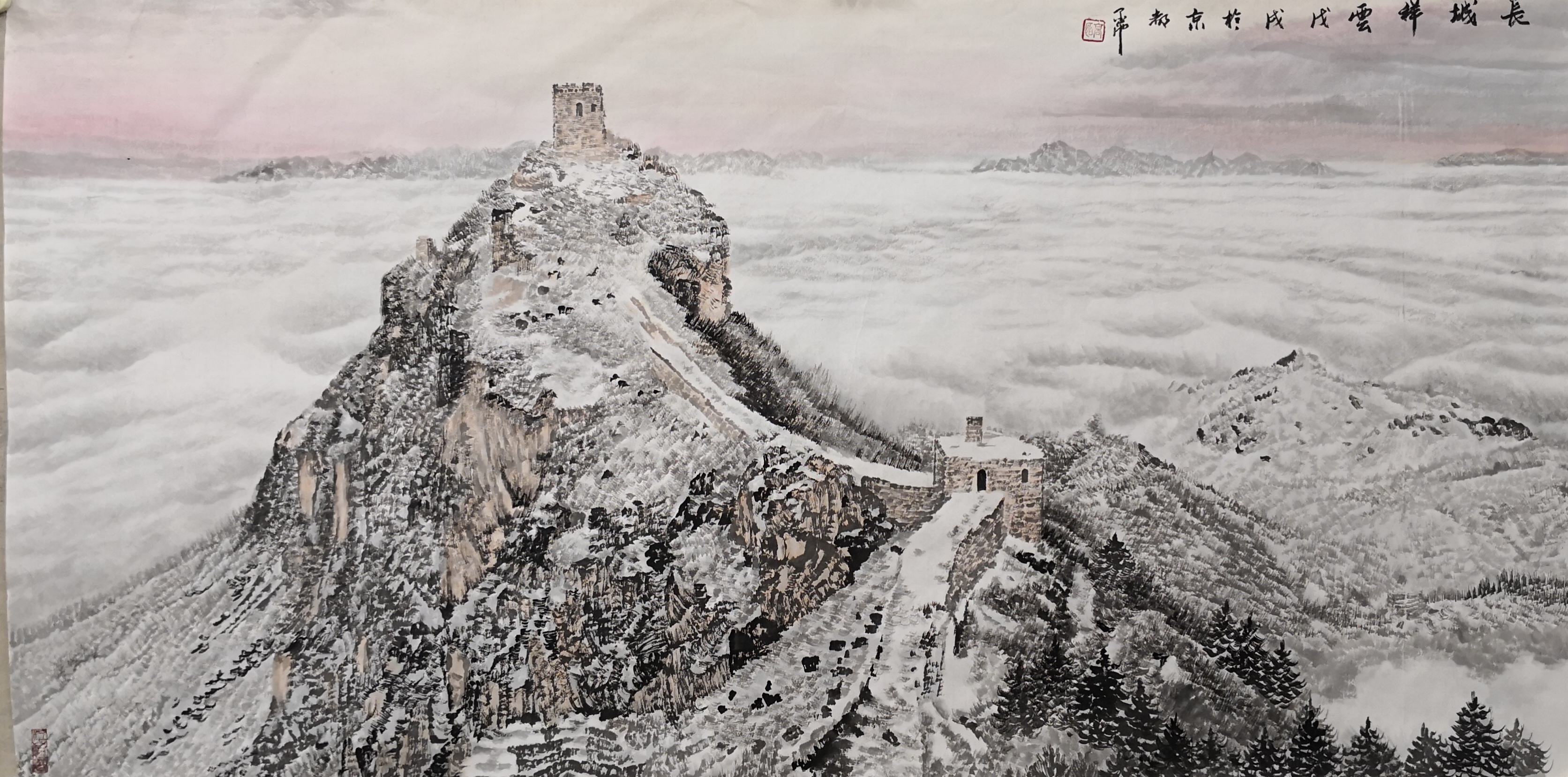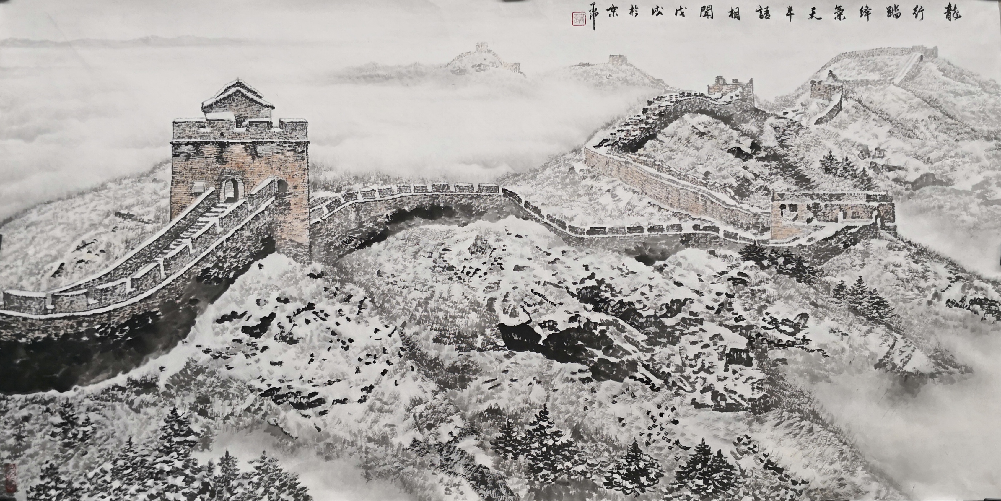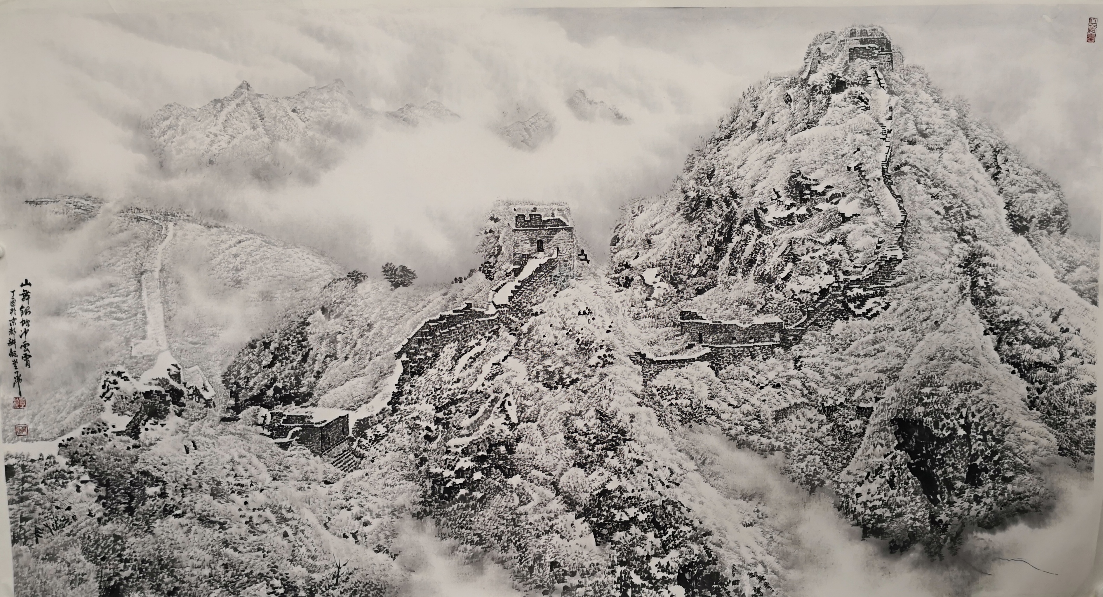 笔法的微观与宏观。高明独创“冰晶皴法”,以枯笔散锋轻扫纸面,营造出冰雪特有的晶莹质感;又以浓墨焦笔勾勒长城砖石,让千年沧桑跃然纸上。观其作画过程,时而如“银瓶乍破”般挥洒写意,时而如“绣花引针”般精雕细琢,在宏大气象与微观细节间游刃有余。